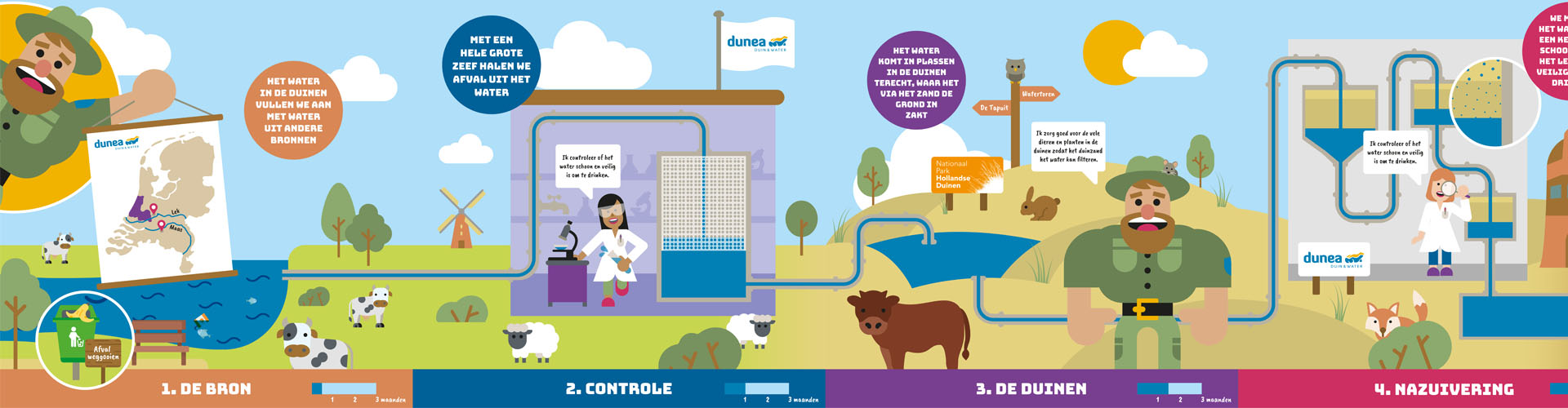 Weet jij dat wij het water dat uit jouw kraan komt, onder andere uit de Afgedamde Maas halen? Als we het water uit deze zijtak van de Maas hebben gehaald, halen we met een hele grote zeef het afval uit het water. Daarna vervoeren we het water in hele grote leidingen naar de plassen in de duinen tussen Noordwijk en Monster. Als het in deze infiltratieplassen zit, zakt het water langzaam de grond in naar onze nazuivering. Daar maken we het water nog één keer heel goed schoon zodat het lekker en veilig is om te drinken. Via grote en lange leidingen komt het water uiteindelijk bij jou thuis of op school uit de kraan.