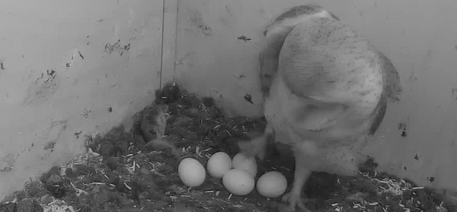 Het eerste ei van onze kerkuilen werd dit jaar gelegd op 27 maart. De kerkuil legt 4 tot 7 eieren. Vorig jaar heeft het kerkuilenkoppel 6 eieren gelegd. Wij zijn erg benieuwd hoeveel het er dit jaar zullen zijn. Jullie ook? Ik duinwachter Bart, hoop net als vorig jaar op 7 eieren. Zoals je kunt zien op de live-beelden heeft het vrouwtje nu al 5 eieren gelegd. Hopelijk komen er nog een paar bij.